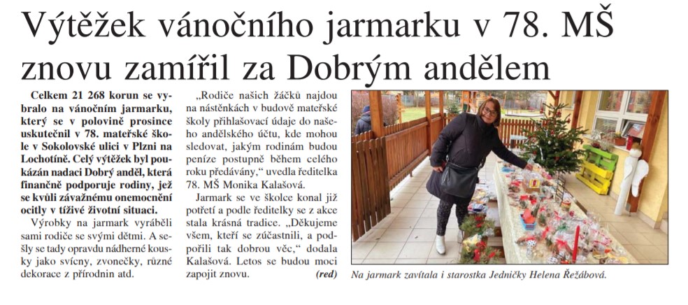 Mnohokrát děkujeme všem, kteří se zapojili do letošního vánočního jarmarku a přispěli nám splnit vánoční dárek všem, kteří to potřebují. Díky Vám se letos podařilo vybrat neuvěřitelných 21,268 Kč. Celá částka bude věnována nadaci „DOBRÝ ANDĚL“.