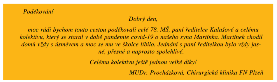V novém vydání Plzeňské 1 vyšlo poděkování od paní doktorky Procházkové, pro celý kolektiv mateřské školy, za provoz IZS v době pandemie Covid-19. Poděkování si velice vážíme!